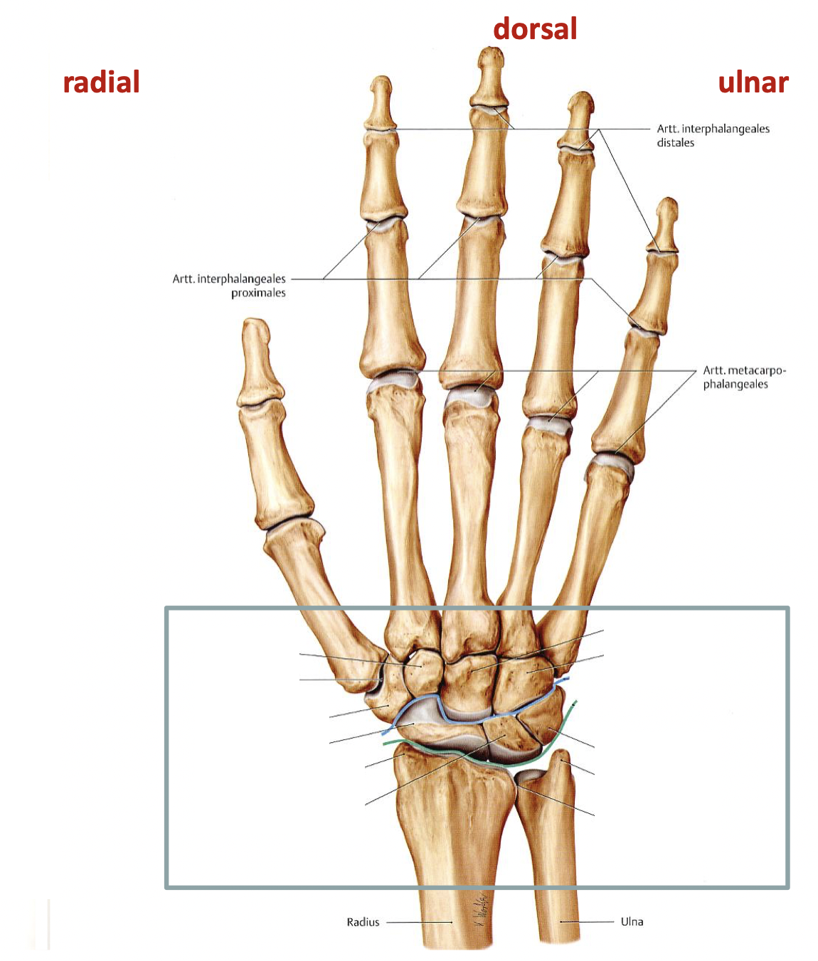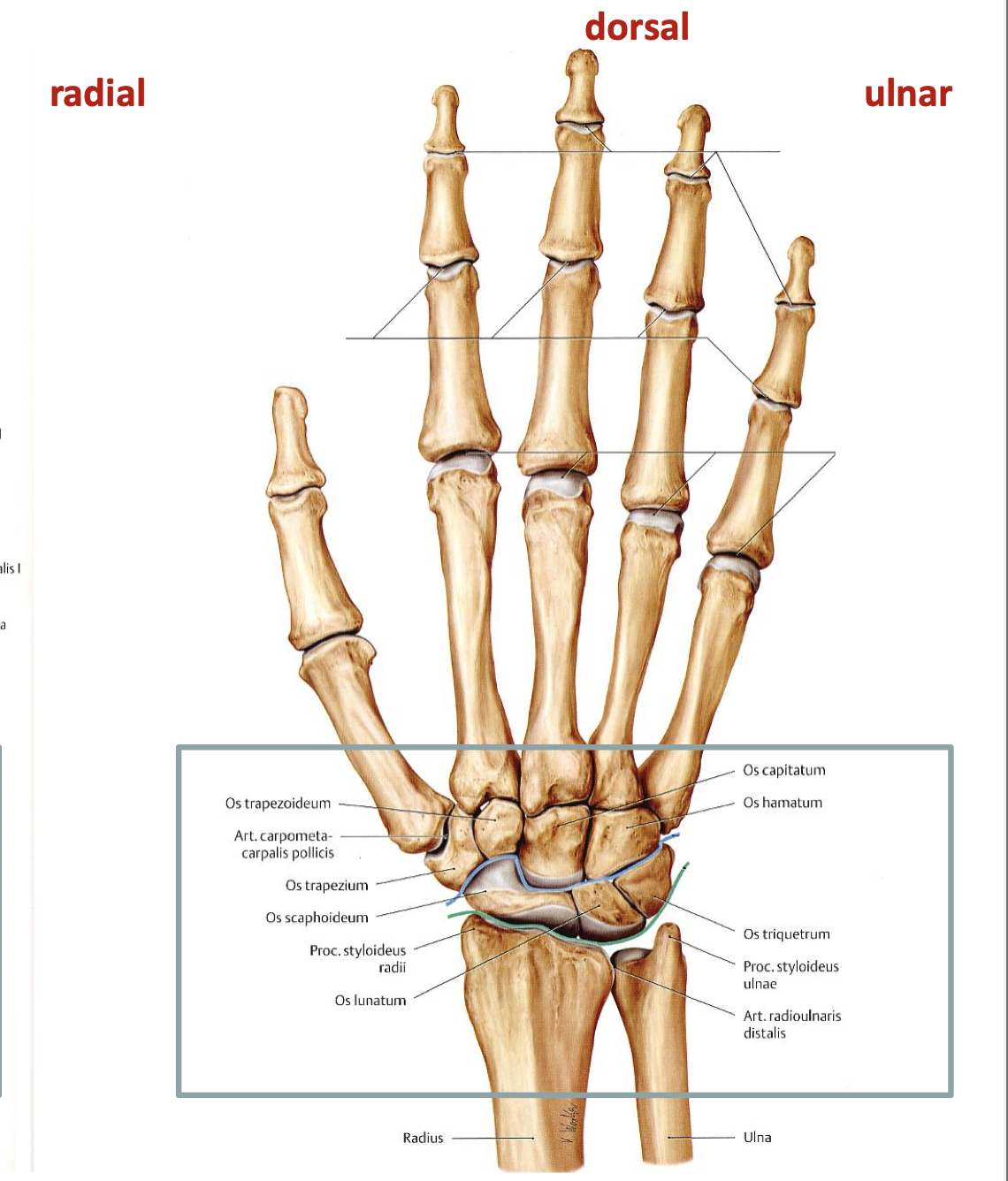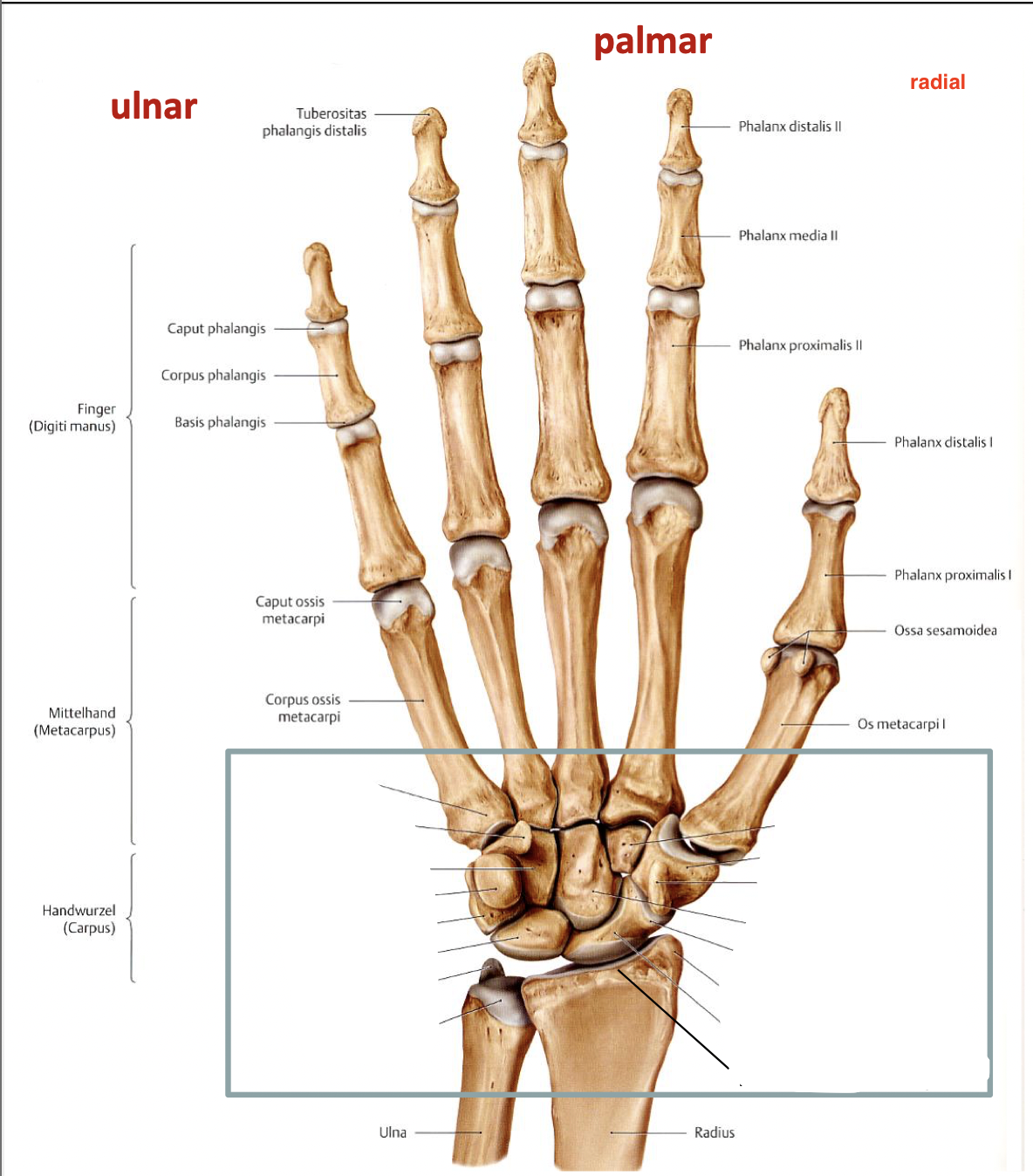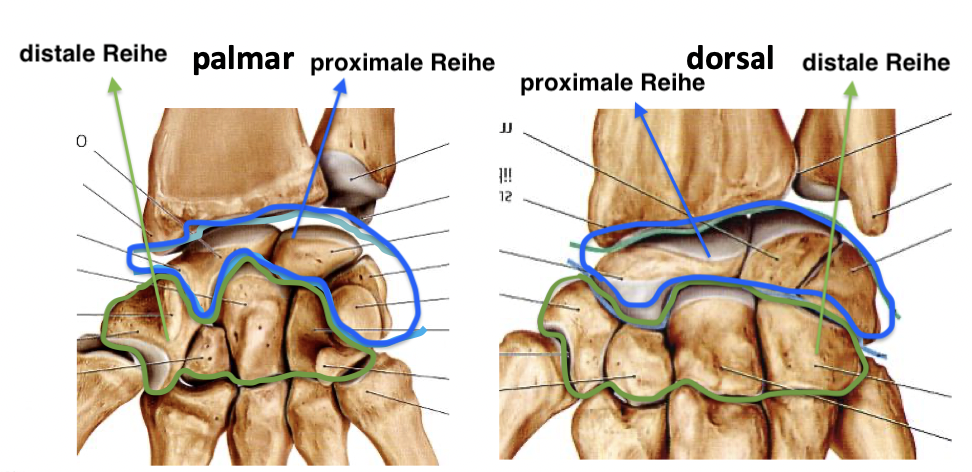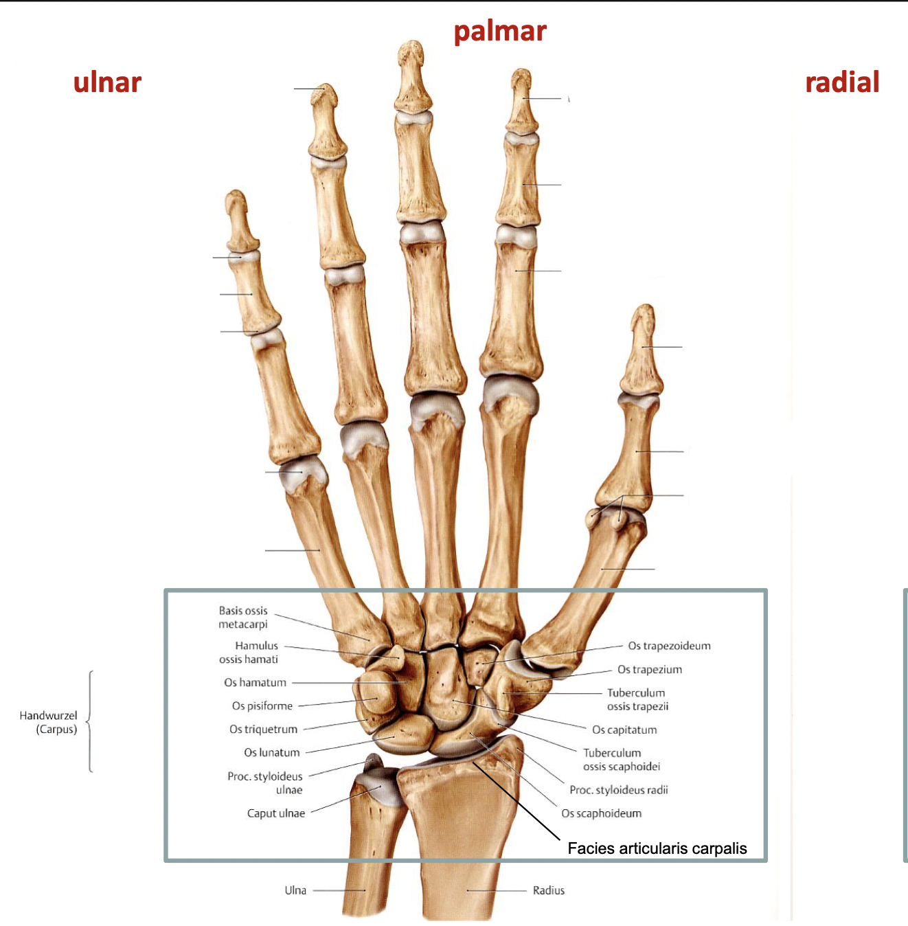 - Beim Durchtritt der Sehnen durch den Canalis carpi liegen diejenige für den III. und IV. Finger palmar, die für den II. und V. Finger dorsal.