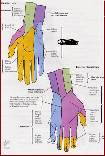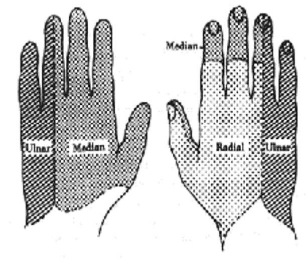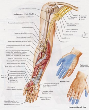 Enters the forearm between the 2 heads of the pronator teres–> gives muscular branches/motor branches in forearm–> hand region (sensory branches) to dorsal and palmar.