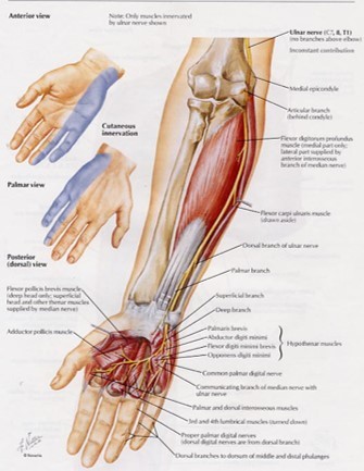Branch coming from the brachial plexus (no branch in arm regoin)–>enters forearm under flexor carpi ulnaris–>intervenes flexor carpi ulnaris and flexor medial digitorum profundus–> enters hand region (gives motor branches to some muslces and sensory branches)