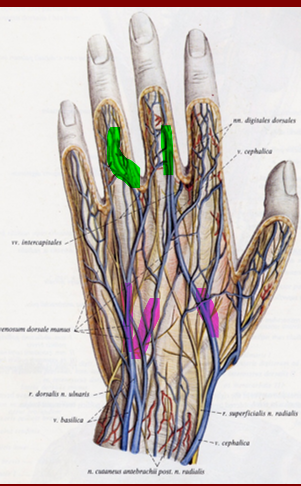Dorsal digital vein–>Metacarpal vein–>Dorsal venous plexus–>Cephalic vein(radial side) and Basilic vein (ulnar side)
