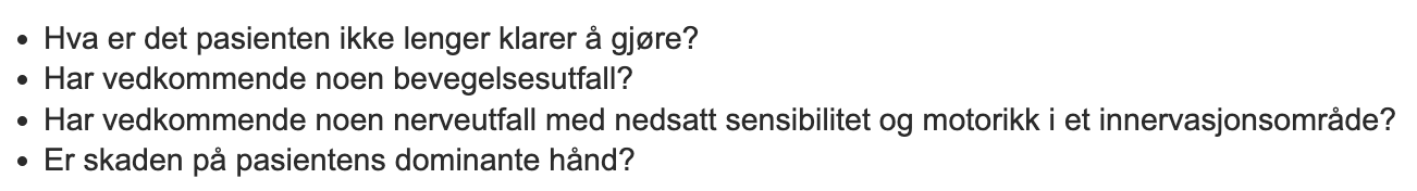 Hvilke funksjonsutfall bør man spørre om ved hånd/fingerskade?