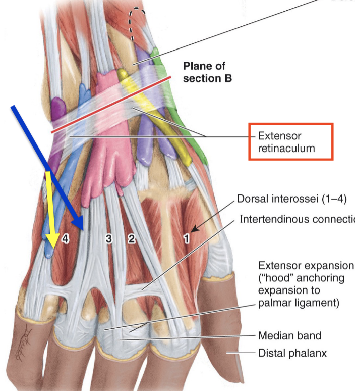 The extensor retinaculum is a band of connective tissue that holds and supports the tendons of certain extensor muscles in place as they cross the wrist and ankle joints. It acts like a strap, keeping the tendons in position and preventing them from bowing outward during muscle contraction. In simpler terms, it helps maintain the alignment and stability of extensor tendons as they pass over joints, facilitating smooth and controlled movements.