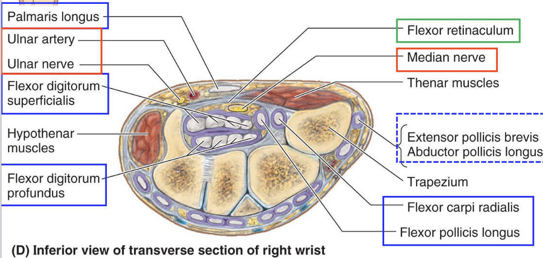 Transverse Carpal Ligament (Flexor Retinaculum): This is a strong band of connective tissue that forms the roof of the carpal tunnel, creating a protective tunnel-like structure.