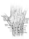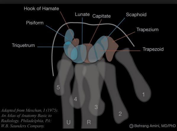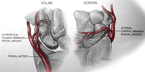 Blood supply: dorsal carpal branch (radial a.) 80% of blood supply of scaphoid via retrograde blood flow (distal to proximal)