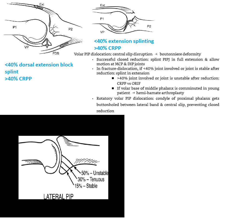 - adj finger 3-6 weels if dorsal dislocation stable after reduction or lateral dislocation