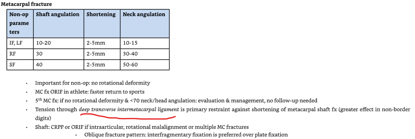 apex volar deformity (flexion of proximal frament through lumbrical, extension of distal fragment through central slip) extensor lag–> corrective osteotomy to improve active PIP extension