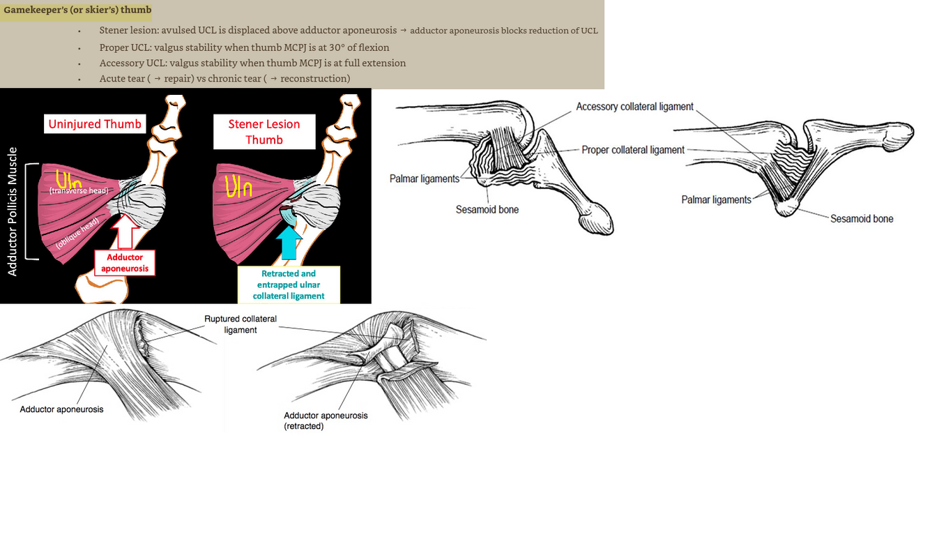 Stener lesion: avulsed ligament w/ or without bony attachment is displaced dorsal and superfiscial to** adductor aponuerosis **