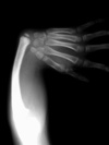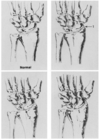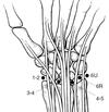 : Patient positioning for carpal tunnel radiograph-wrist is extended 70 degrees, and beam is angled 25-30 deg to the long axis of the hand(arrow).