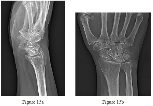 15. Figures 15a and 15b are the radiographs of a 62-year-old right-hand-dominant woman who has right wrist pain. Thirty years ago she underwent scapholunate ligament repair. She never fully regained wrist motion or strength and reports that her pain and stiffness have progressed substantially during the last 5 years. An examination reveals decreased wrist flexion and extension and tenderness along the radiocarpal joint. She attempted bracing and corticosteroid injections without experiencing lasting symptom relief. Which surgical treatment will most likely provide pain relief and preserve motion?