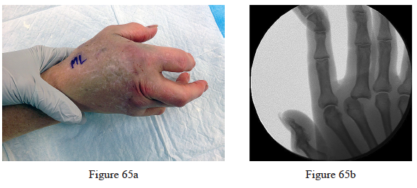 65. Figure 65a is the clinical photograph of a 64-year-old man who crashed while riding his motorcycle. An examination reveals his long-finger metacarpophalangeal (MP) joint is stuck in extension. He cannot passively or actively flex at the MP joint. A hand radiograph is seen in Figure 65b. Which interposed structure is preventing reduction?