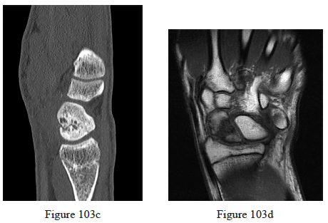 103. Figures 103a through 103d are the radiographs, sagittal-cut CT scan, and coronal T1 MR image of a 16-year-old boy who has wrist stiffness and pain after sustaining an injury 2 years ago. There is no bleeding from the proximal pole during surgery. Which procedure will most likely result in restoration of alignment and healing?