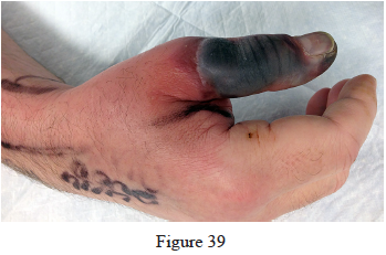 39. Figure 39 is the right hand of a 65-year-old man with a history of hypertension and rheumatoid arthritis. He is taking immunosuppressive disease-modifying antirheumatic drugs (DMARDs) and is seen in the emergency department with rapid progression of erythema from his right thumb to his right arm during the last 12 hours. He is confused, lethargic, and has these vital signs: blood pressure 92/40, respiratory rate 45, temperature 39.7°C, pulse 135, and oxygen saturation 90% on 4 liters of oxygen by face mask. An examination of his right upper extremity reveals black bulla extending from the metacarpophalangeal down to the tip and no capillary refill at the pulp. Immediate treatment should consist of