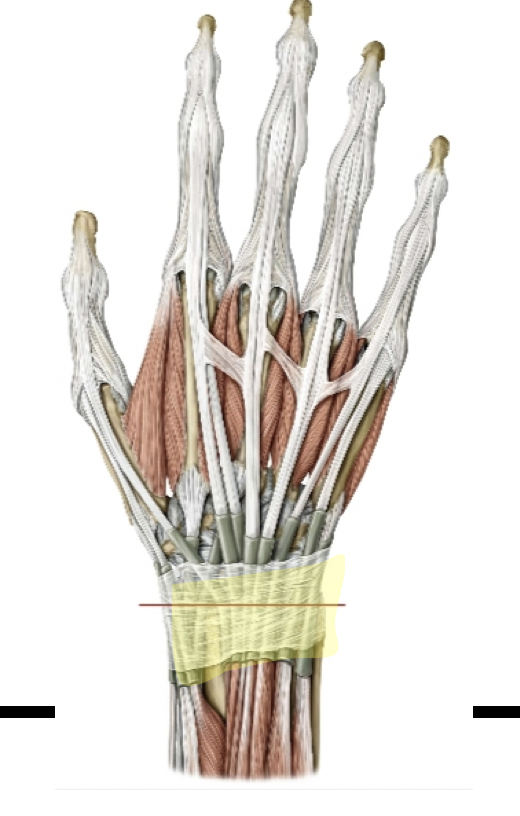 Extensor retinaculum, a thickening of the antebrachial fascia that holds in place the tendons passing from the forearm into the hand