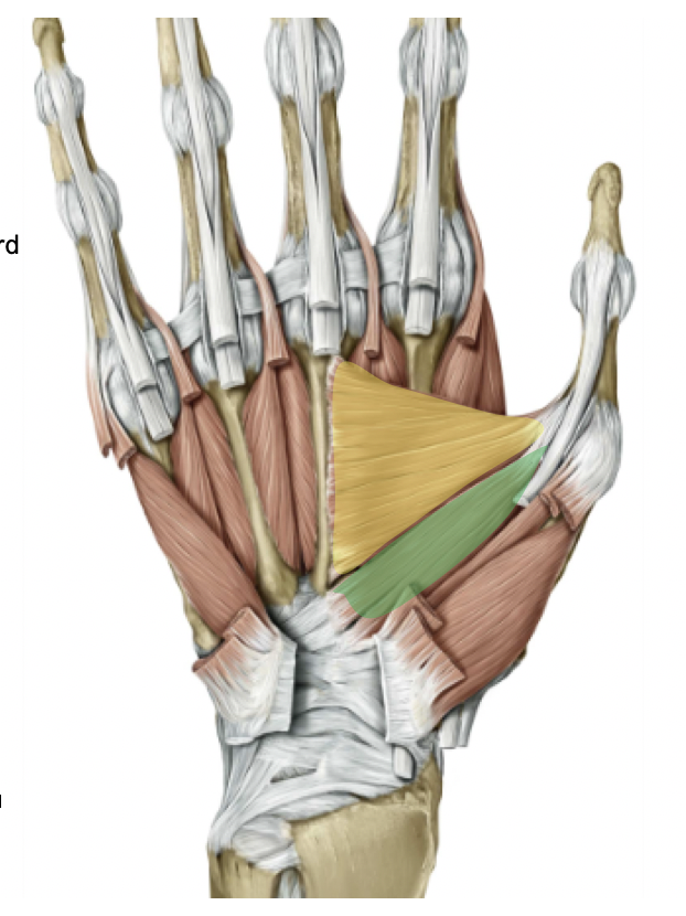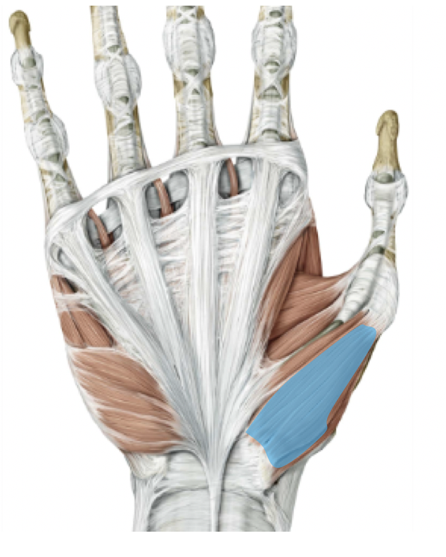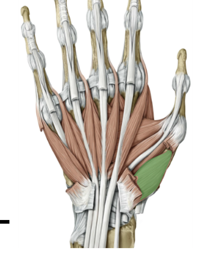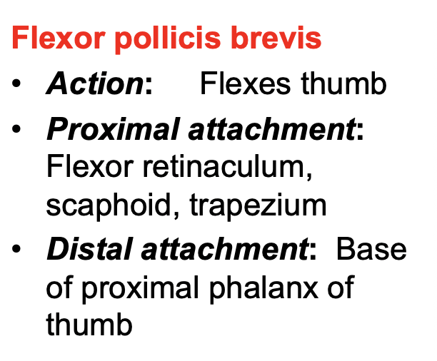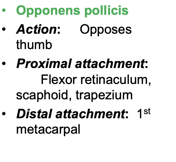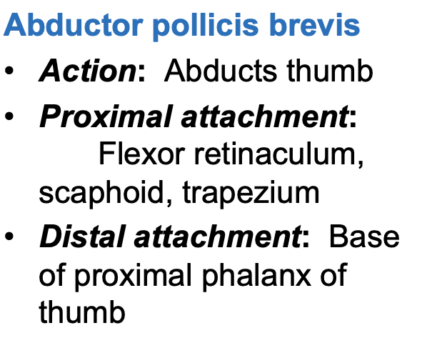 Thenar muscles that abduct and oppose the thumb (extensor pollicis brevis, abductor pollicis brevis, opponens pollicis), innervated by the recurrent branch of median nerve