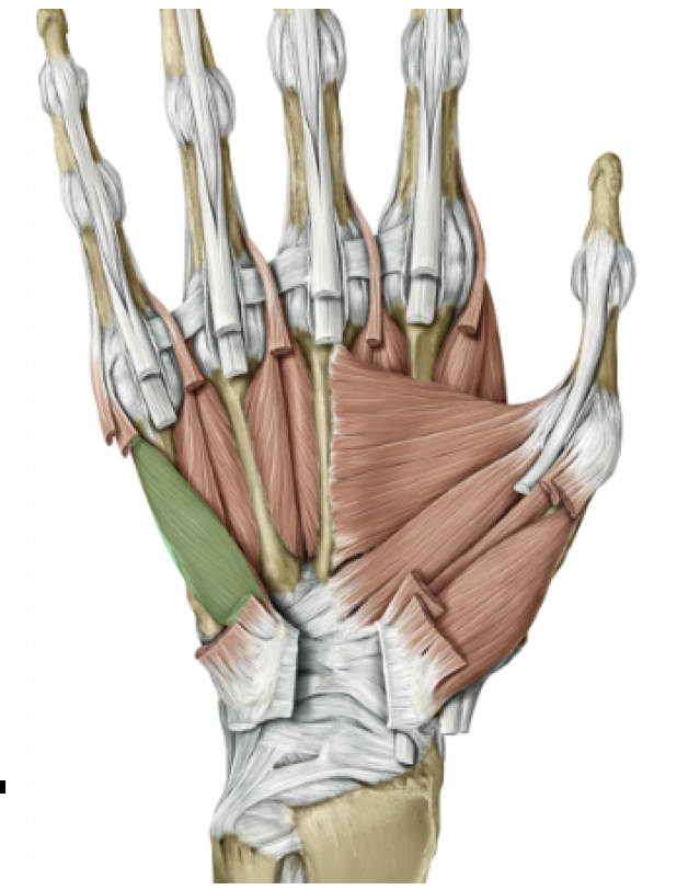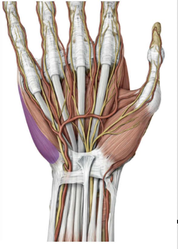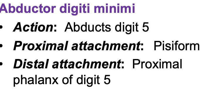 Hypothenar muscles that flex, abduct, and oppose digit 5 (abductor digiti minimi, flexor digiti minimi brevis, and opponens digiti minimi), innervated by deep branch of ulnar nerve