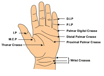 I: DIP joint. Mallet finger II: Middle phalanx III: PIP joint. Central slip injury. If triangular ligament is disrupted, lateral bands migrate volarly resulting in boutinniere finger. IV: Proximal phalanx V: MCP joint. Injury from fight bite. Repair tendon and sagittal bands as needed VI: Metacarpal. VII: Wrist VIII: Distal forearm. At MSC jxn IX: proximal forearm.