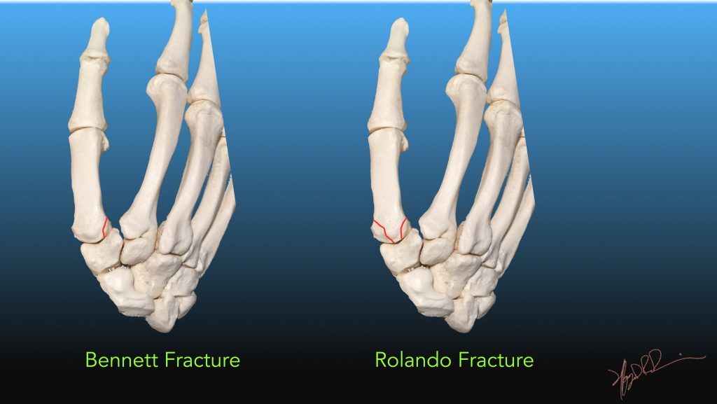 Base of thumb metacarpal fx (type 2): Intraarticular fracture with Y-shape. DJD after