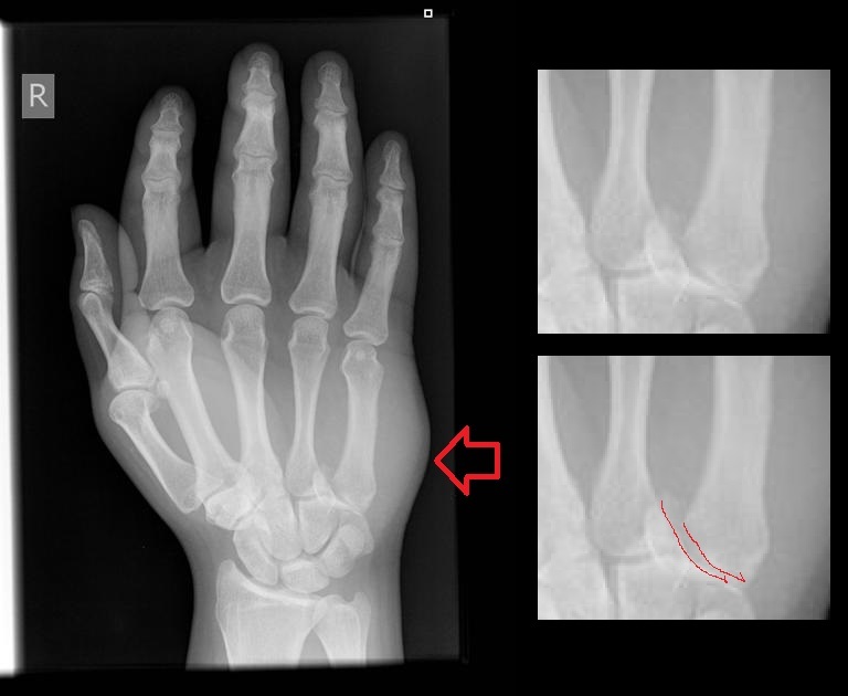 Base of thumb metacarpal fx (type 1): intraarticular fracture with proximal and radial dx of 1st metacarpal. Triangular bone fragments. APL deforms