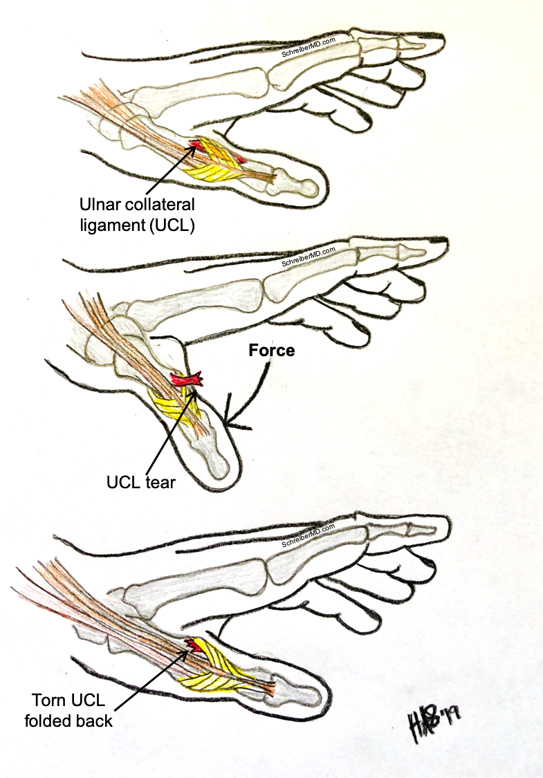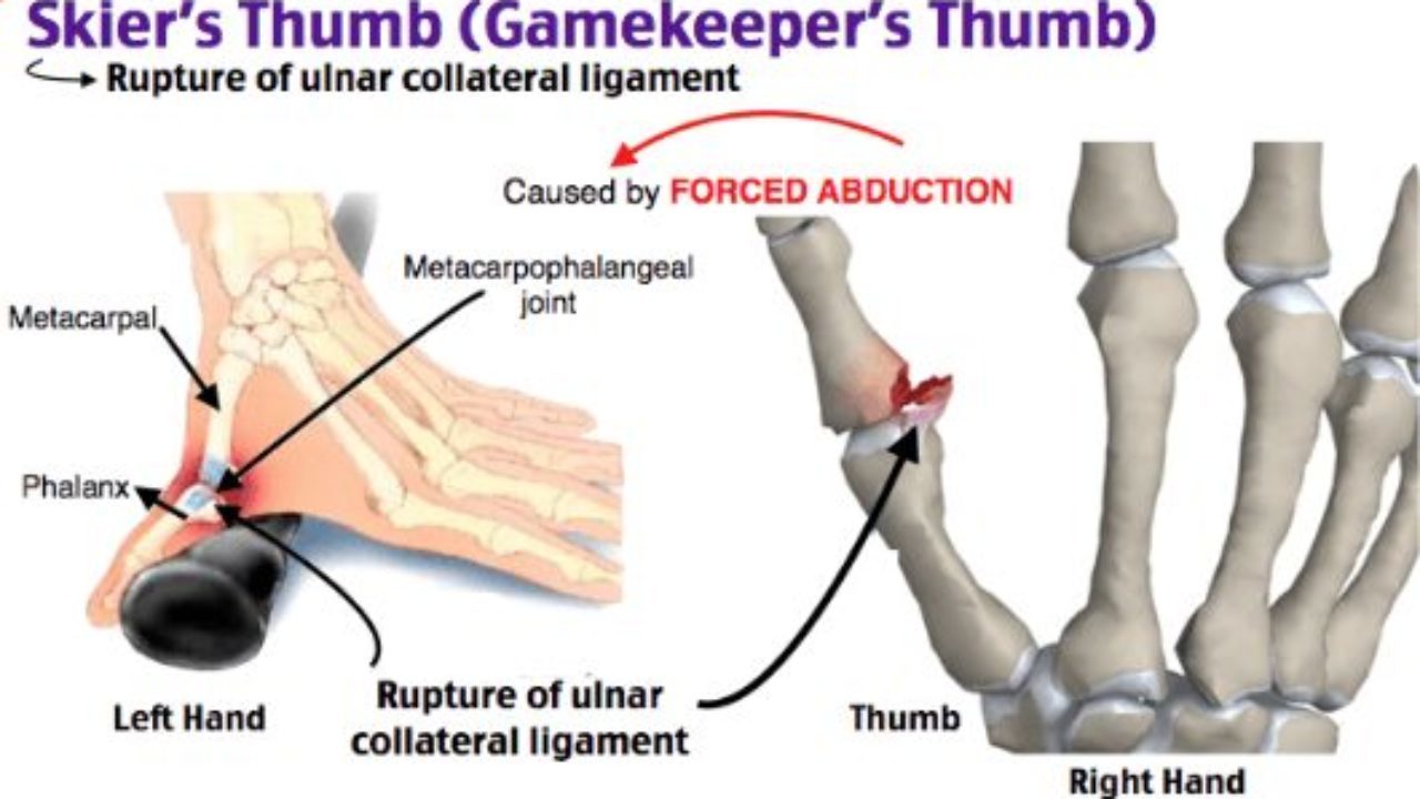 Thumb MCP joint proper ulnar collateral ligament injury from forced radial deviation. Ski pole injury often. Stener lesion seen. Test at 30° flexion