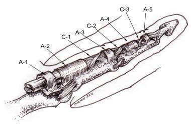 A1 MCPJ, A2 proximal phalanx, A3 PIPJ, A4 middle phalanx, A5 DIPJ.