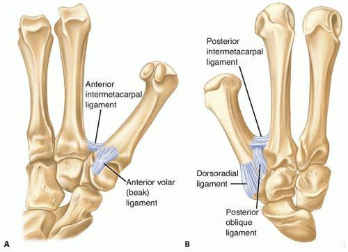 Dorsal trapezium to dorsal MC base. Strongest ligament. Torn in dorsal dx.