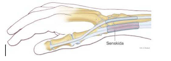 Helst ortos och kortison fungera bra, men även kirurgi kan göras. (lägg kortison runt sena aldrig i sena)