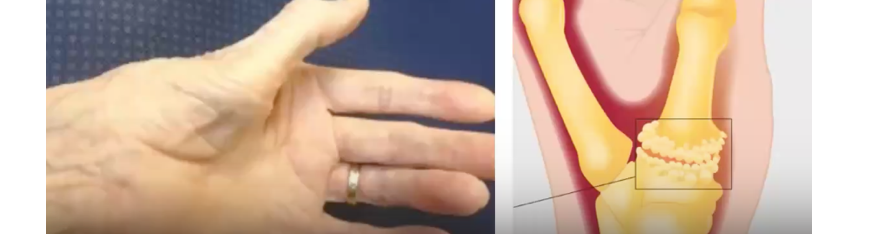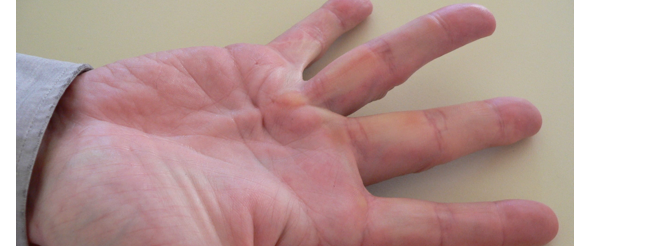 Den palmara fascian blir förtjockad (p.g.a. långvarig inflammation), ger progressiv krökning av ett eller flera fingrar, vanligen dig 4-5.