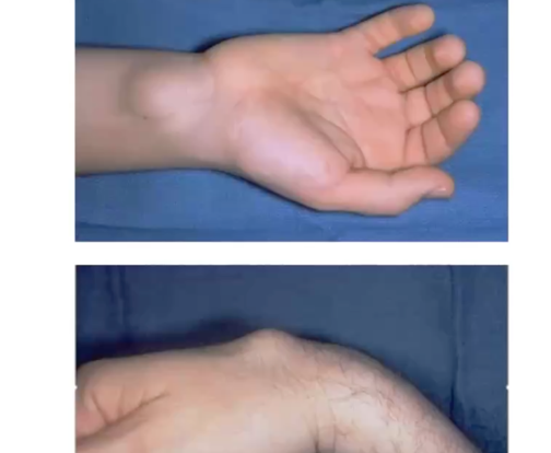 Som ett bråck ifrån led/senskida där de kommer ut vätska ifrån è ger en liten knöl (ofta ulenart eller dorsalt på handleden)