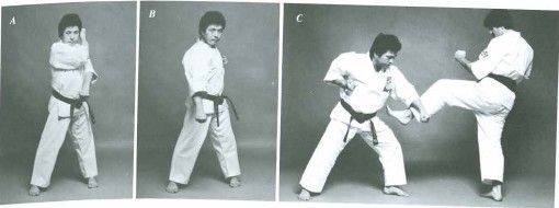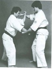 Opponent front snap kick to mid-section being blocked with juji-uke. Usually when your left foot is front your left arm is underneath your right.