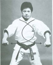 One arm up and other arm in a lower position. When technique is done the upper arm goes down inside of the other in a circular motion. Upper hand should be shoulder height. Picture shows chudan uchi uke-gedan barai to block awase zuki.