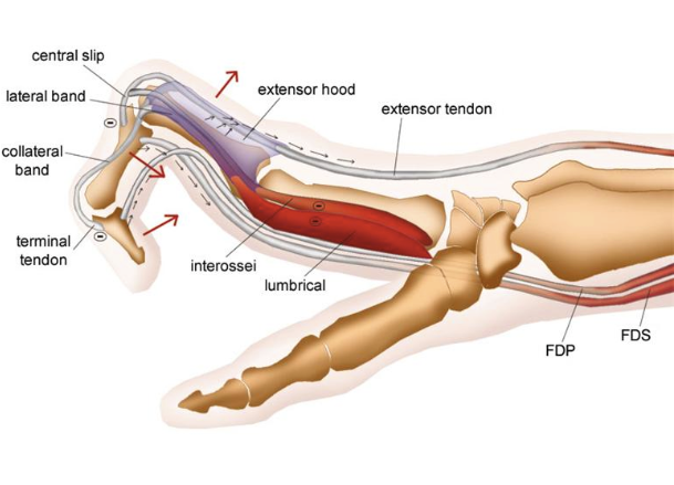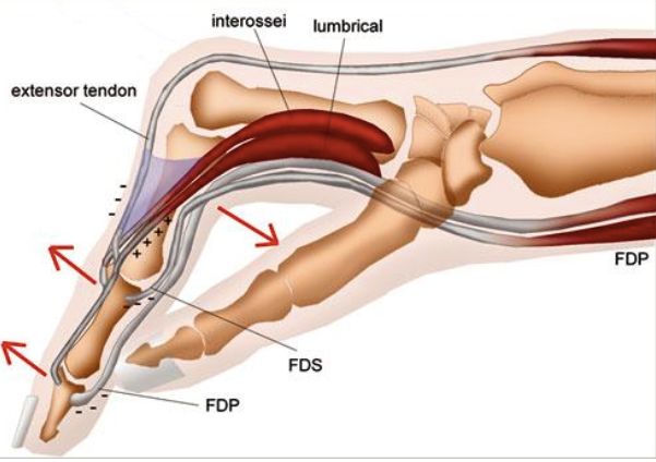 1) With the MCPJ in extension the intrinsics are put on a stretch. Try to flex the PIPJ with MCPJ in extension. If it doesn’t flex = tight intrinsics or joint capsule contracture.