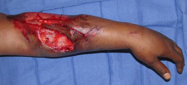 Carpal tunnel release is an important component of a forearm fasciotomy; however, it is not sufficient decompression alone. Emergent decompressive fasciotomy should precede wound debridement, demarcation of tissue loss, and splinting of the extremity. Skin grafting of the wounds (including the skin incisions for fasciotomy) may or may not be needed after resolution of limb edema.