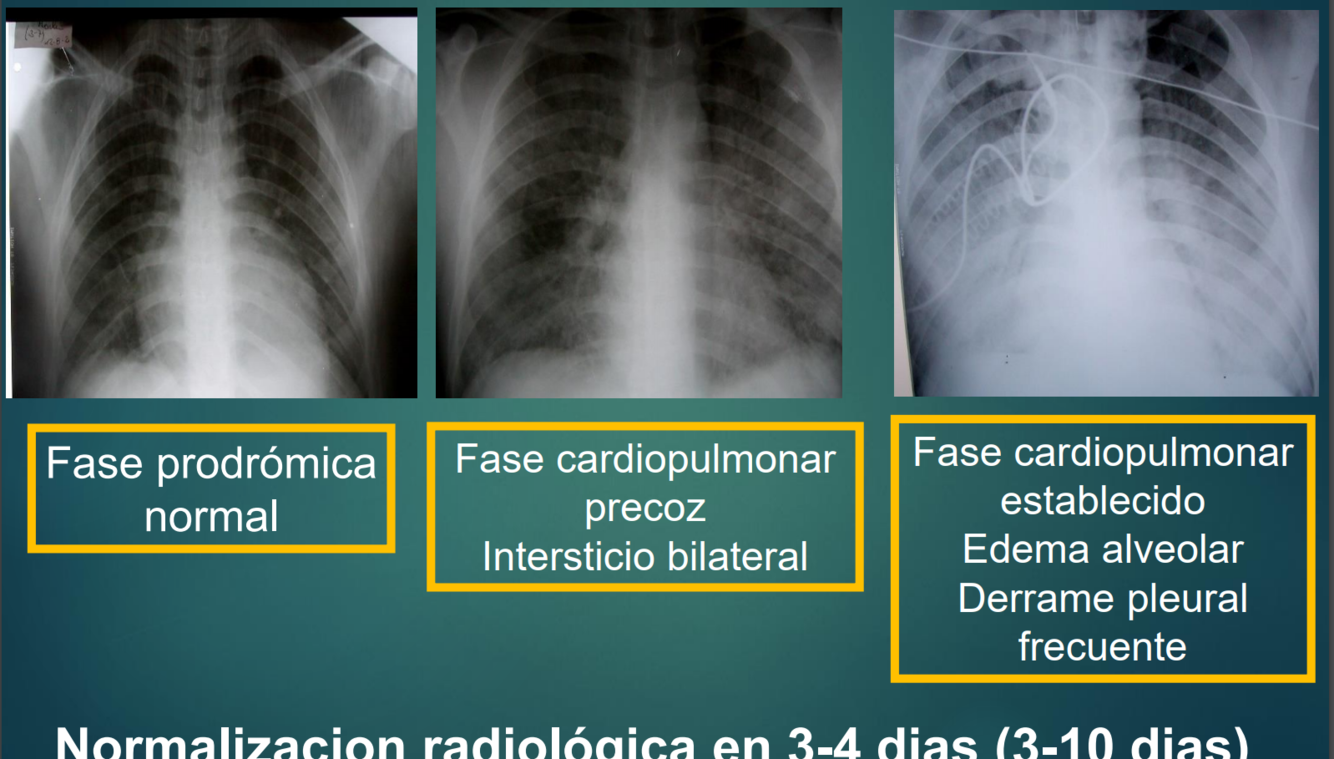 Las manifestaciones clínicas se pueden dividir en cuatro fases: prodrómica (o febril), cardiopulmonar, diurética y de convalecencia: