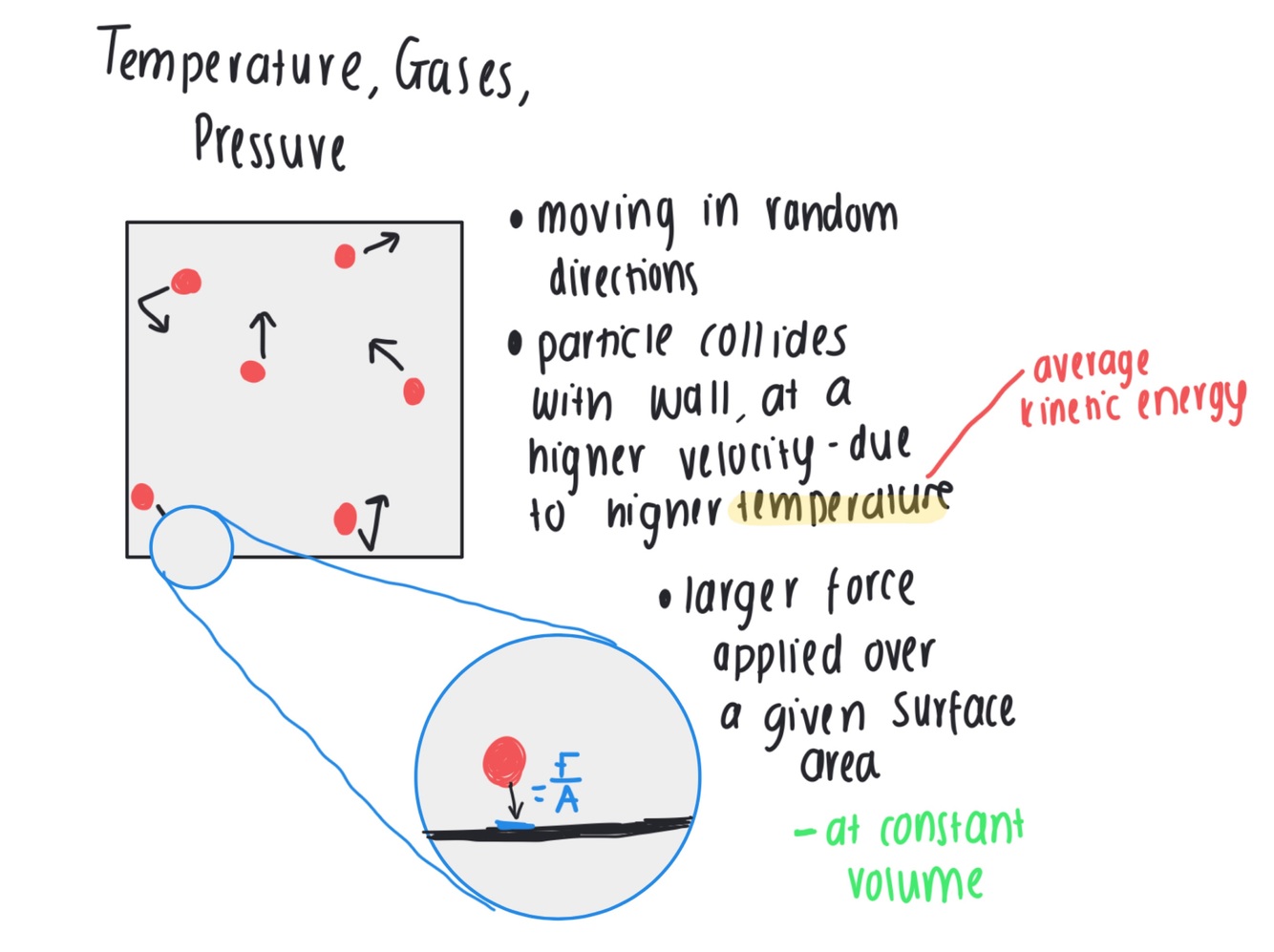 The more temperature, the faster the particles move, the more frequently the particles collide with the container walls, the more force is exerted resulting in more pressure.