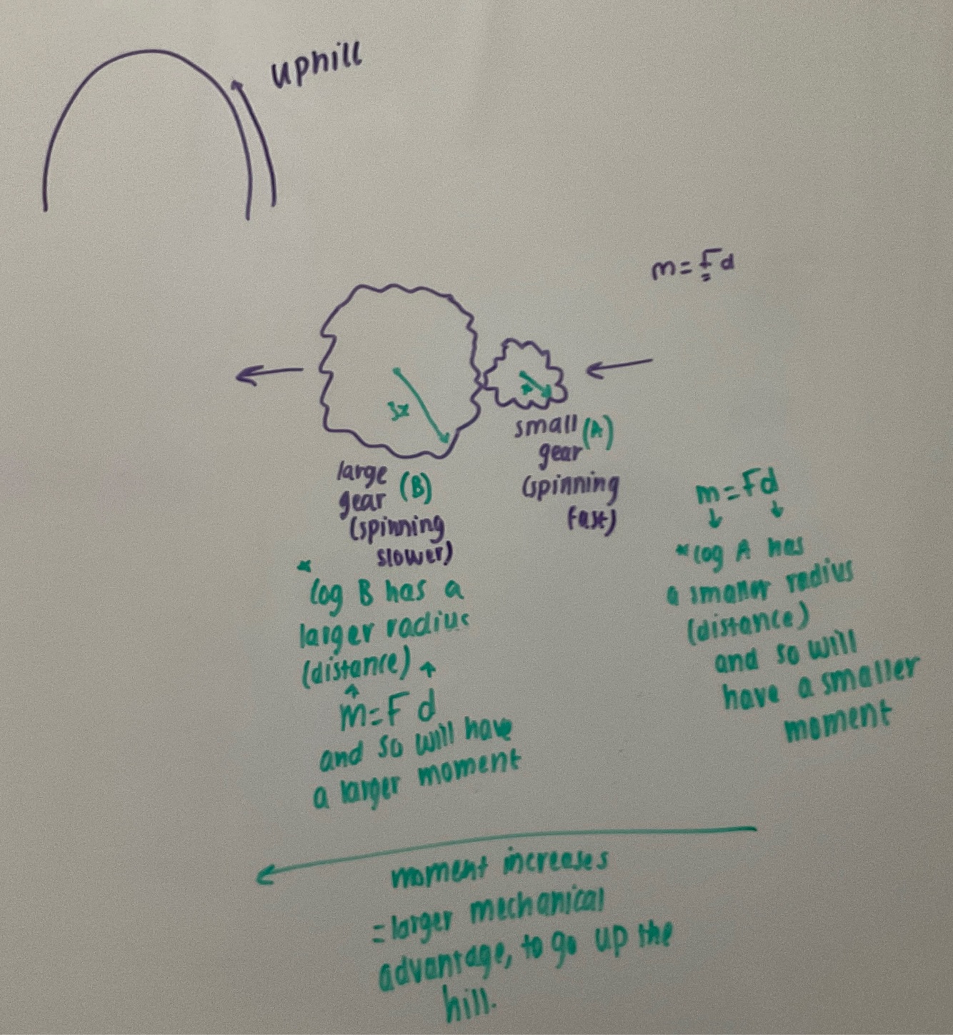 🟢you change to a lower gear 🟢the means input gear is a small gear is connected to a larger gear 🟢a input larger moment 🟢an output smaller moment 🟢causing the wheel to turn more slowly