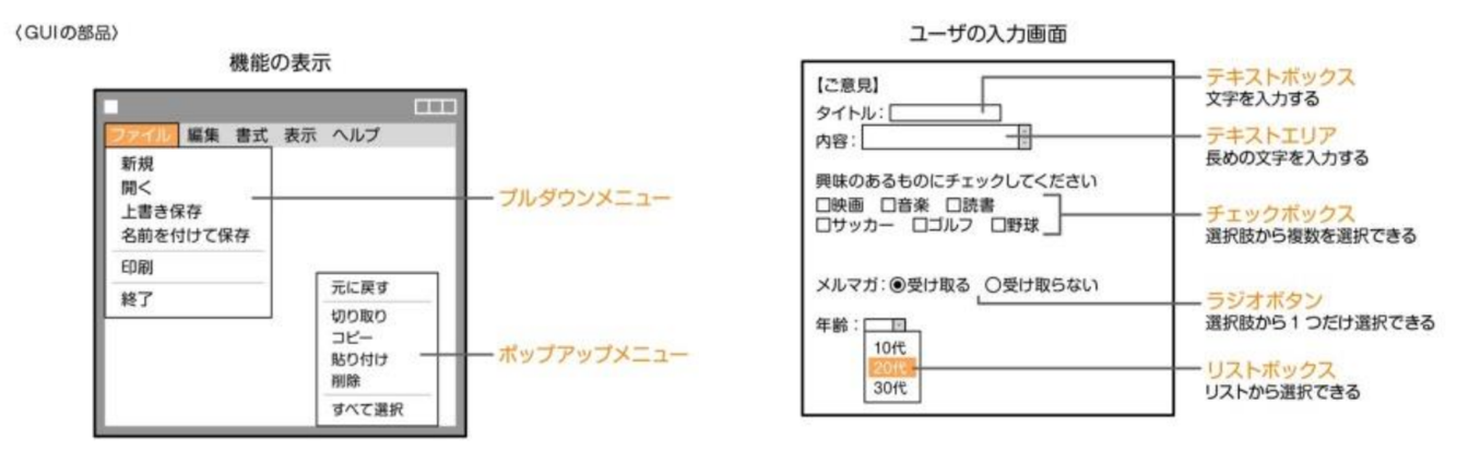 GUI の画面設計においては、次のような部品を使って設計することができます。