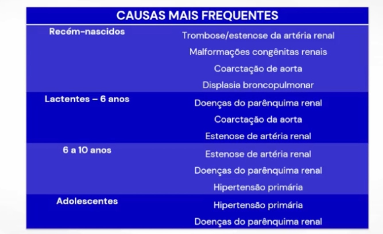 Quais as causas de HAS por idade na pediatria?