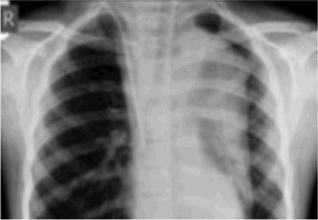 (SURCE 2018 R3 CLÍNICA MÉDICA) - Jogador de basquete, de 17 anos, dá entrada no hospital com dor torácica de intensidade intensa que irradia para uma região dorsal, sem queixas de dispneia. O mesmo já foi resolvido recentemente devido a um problema ocular ou que pode ser identificado como “deslocamento da lente”. Quando criança, refere-se a destacar-se nos esportes, devido à sua altura e grande mobilidade articular. Realizou a seguinte radiografia de tórax: