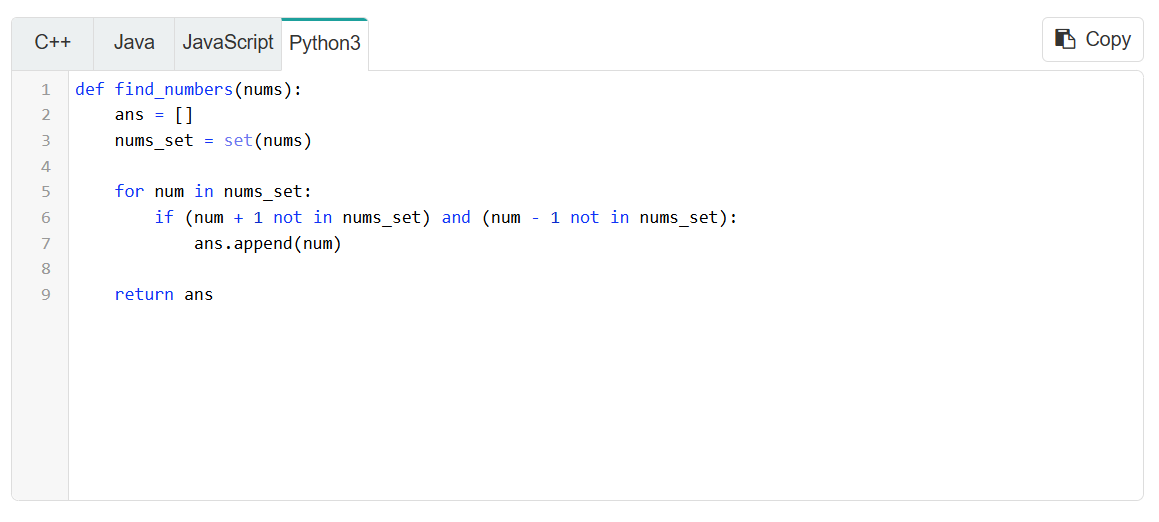 Example 3: Given an integer array nums, find all the numbers x in nums that satisfy the following: x + 1 is not in nums, and x - 1 is not in nums.