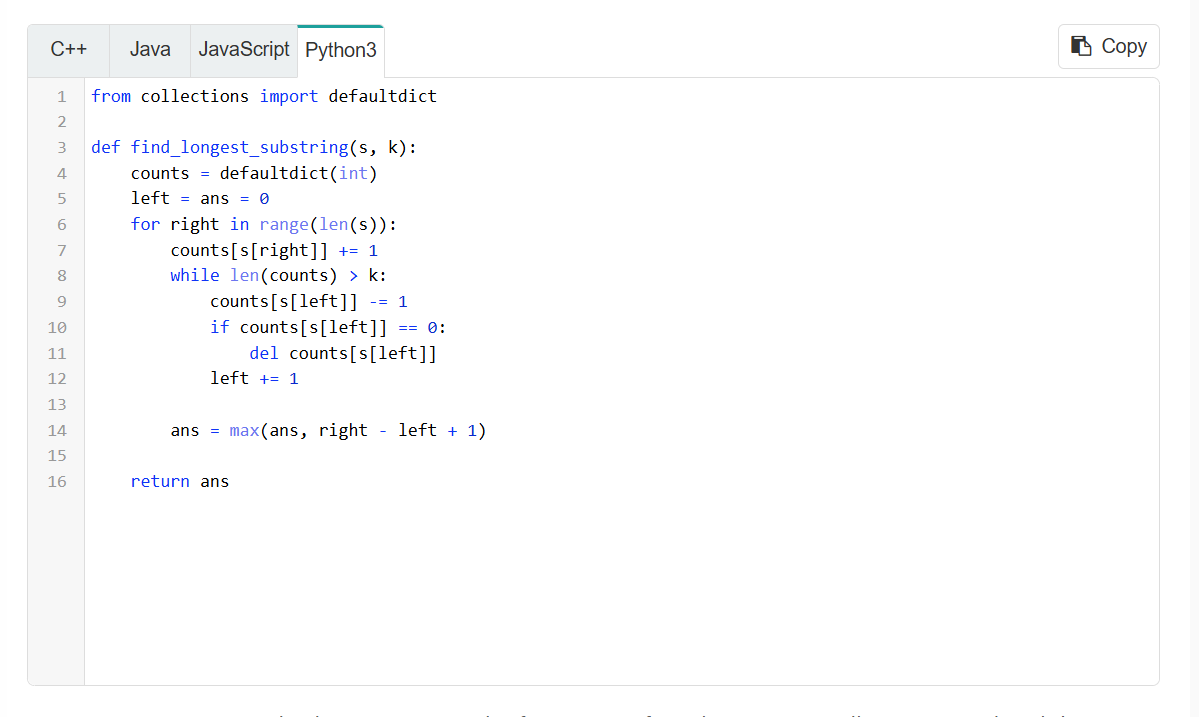 For example, given s = “eceba” and k = 2, return 3. The longest substring with at most 2 distinct characters is “ece”.