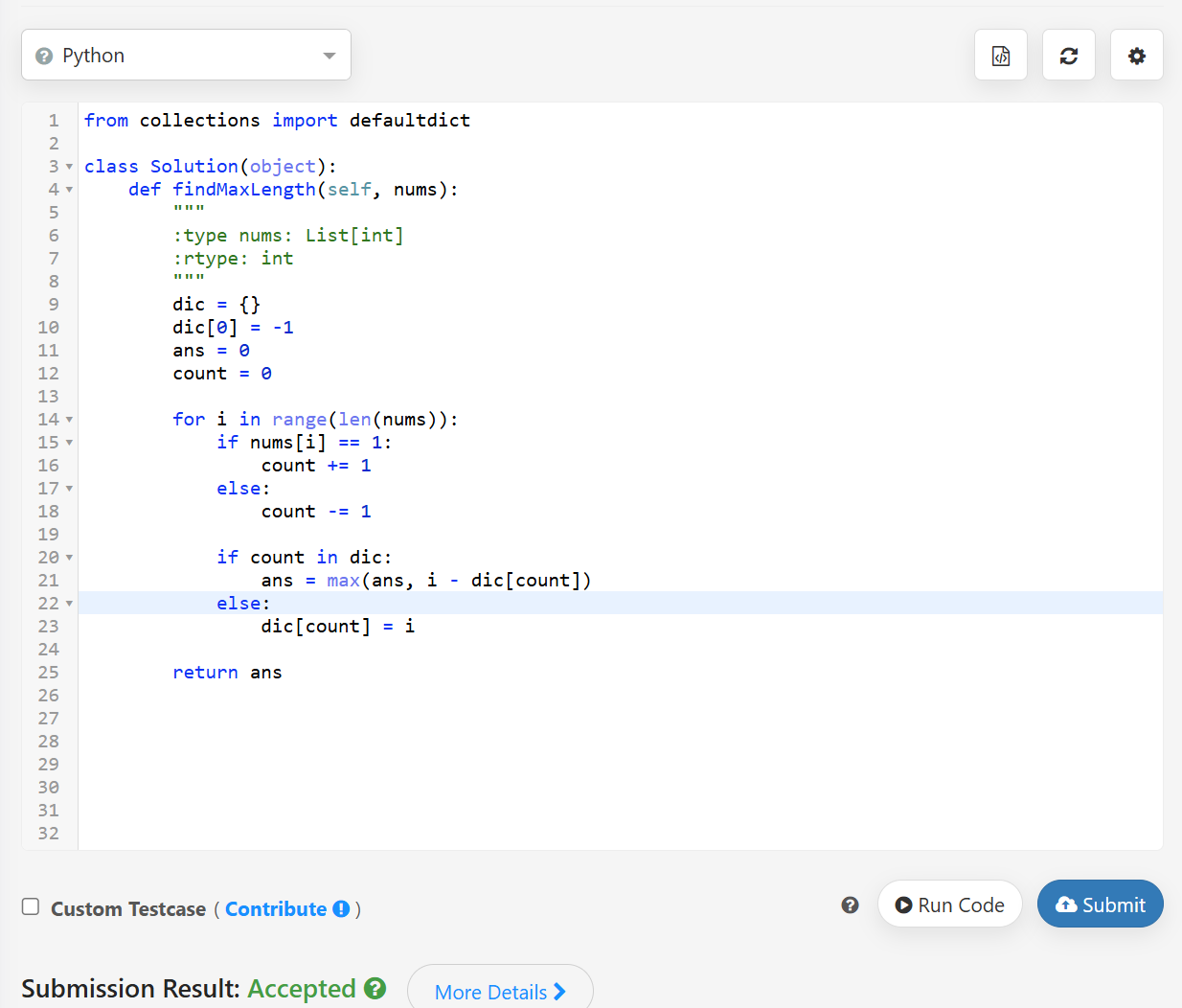Given a binary array nums, return the maximum length of a contiguous subarray with an equal number of 0 and 1.