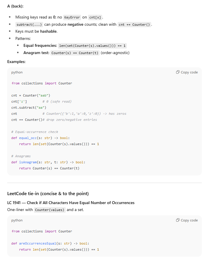 What are common gotchas with Counter (missing keys, negatives, cleaning), and quick patterns for equal frequencies / anagrams?