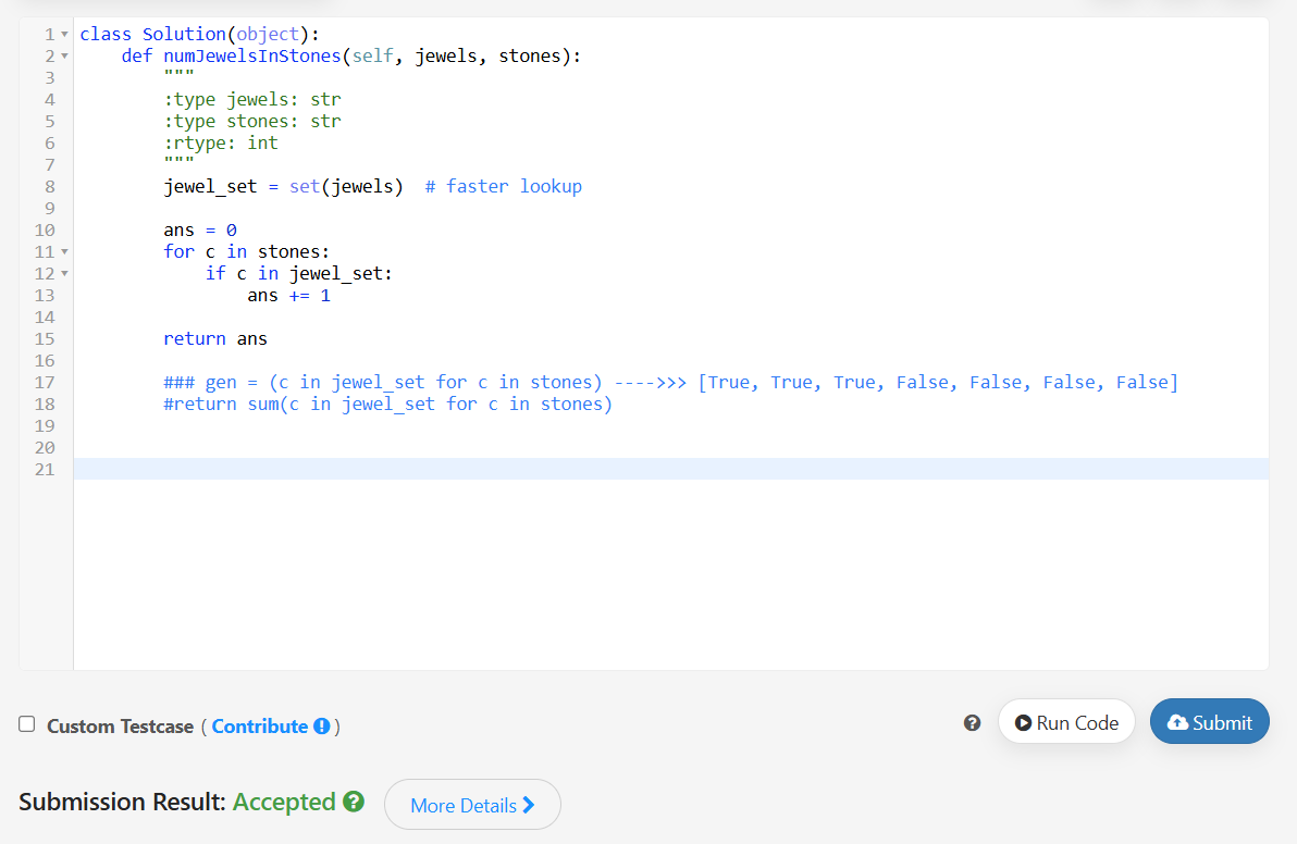 You’re given strings jewels representing the types of stones that are jewels, and stones representing the stones you have. Each character in stones is a type of stone you have. You want to know how many of the stones you have are also jewels.