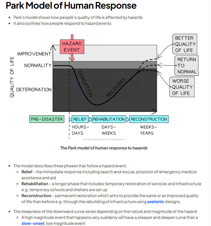 how a countries quality of life changes overtime before during and after a hazard event and is mainly used to compare responces in HICs and LICs.