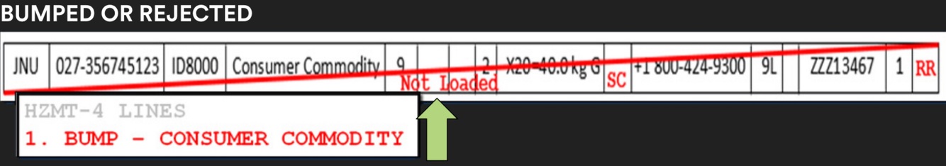 Bumped or Rejected items are noted as such on the NOTOC and initialed. The ACARS closeout will show this change when available.