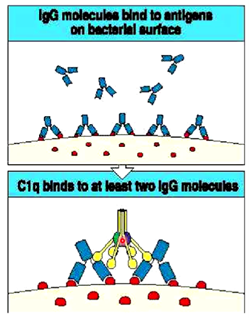 IgG’s binden aan het antigeen en twee gebonden IgG’s binden aan C1q waarop C1q wordt geactiveerd. C1q’s zijn eiwitten die in het bloed circuleren. C1q zet een cascade in werking, een complement systeem met als resultaat meer eindproduct. Onder in het complementsysteem staat het membrane attack complex, een boormachine die gaten maakt in de membraan van bacteriën (maar ook van gewone cellen zoals podocyten). Pas als er een complex is gevormd, wordt de cascade in werking gezet.