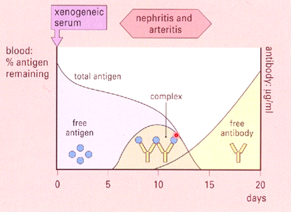 De eerste cel herkent het antigeen, gaat naar de lymfeklier en presenteert het daar middels een antigeen presenterende cel (APC) aan geheugencellen. Deze cellen gaan extra IgG maken. Na een week of twee is de IgG productie goed op stoom en is er een optimale verhouding tussen IgG en antigeen en treden de immuuncomplexen op. Een paar dagen later zijn er meer vrije IgGs aanwezig ten opzichte van de antigenen. Als het aantal immuuncomplexen erg hoog is, kan er een nefritisch syndroom ontstaan (dus na een infectie pas na twee weken).
