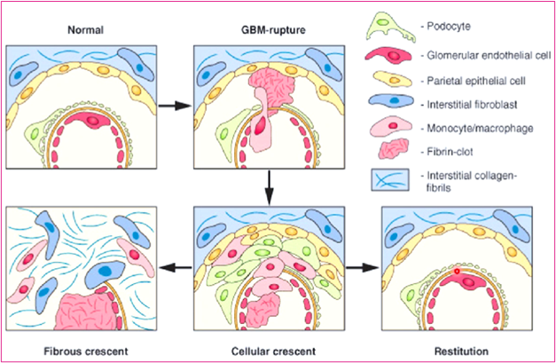 Komt door een lokale doorbraak van de filtratie barrière. Waarbij je stollingsmateriaal krijgt in de Kapsel van Bouwman en uittreding van witte bloedcellen (ontstekingscellen) uit de capillairen naar de Kapsel van Bouwman. Dit leidt tot een enorme prikkeling van de epitheelcellen. De prikkeling van de epitheelcellen vormt een halve maan door de proliferatie, en die halve maan kan of beter worden of verbindweefselen.