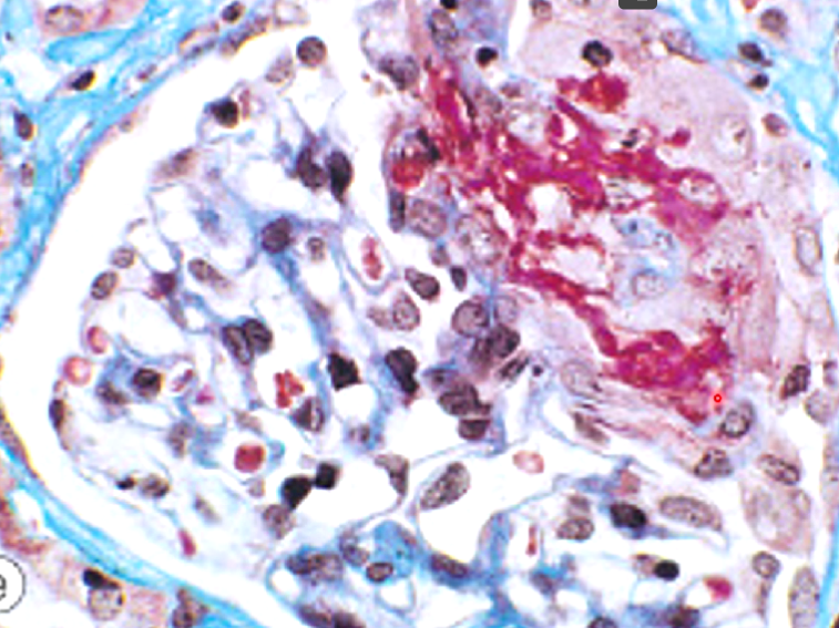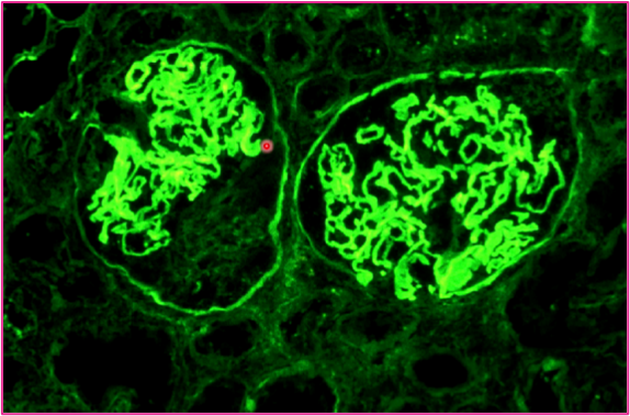 Anti IgG als marker voor de IgG die zich bevindt in het basaalmembraan. Er is sprake van lineaire immunofluorescentie: over de gehele lijn van het glomerulaire basaalmembraan zie je IgG neerslagen. Aan de andere kant van de glomerulus zie je geen aankleuring omdat daar de extracapillaire proliferatie zit.