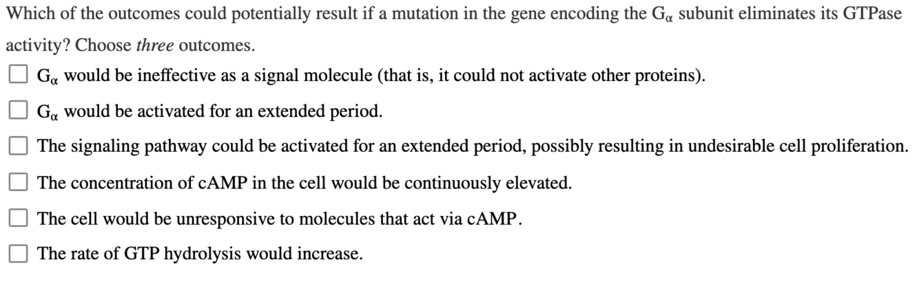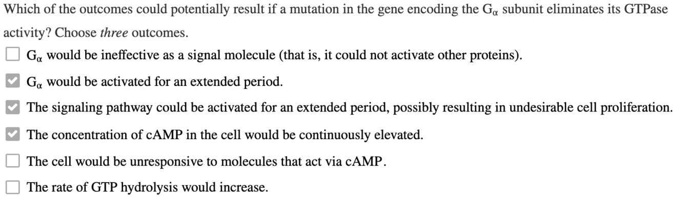 Er is een gemuteerde vorm van de α-subeenheid van het heterotrimere G-eiwit geïdentificeerd; deze vorm wisselt gemakkelijk GDP voor GTP, zelfs in afwezigheid van een geactiveerde receptor. Wat zou het effect zijn op een signaalroute die de gemuteerde α-subeenheid bevat?